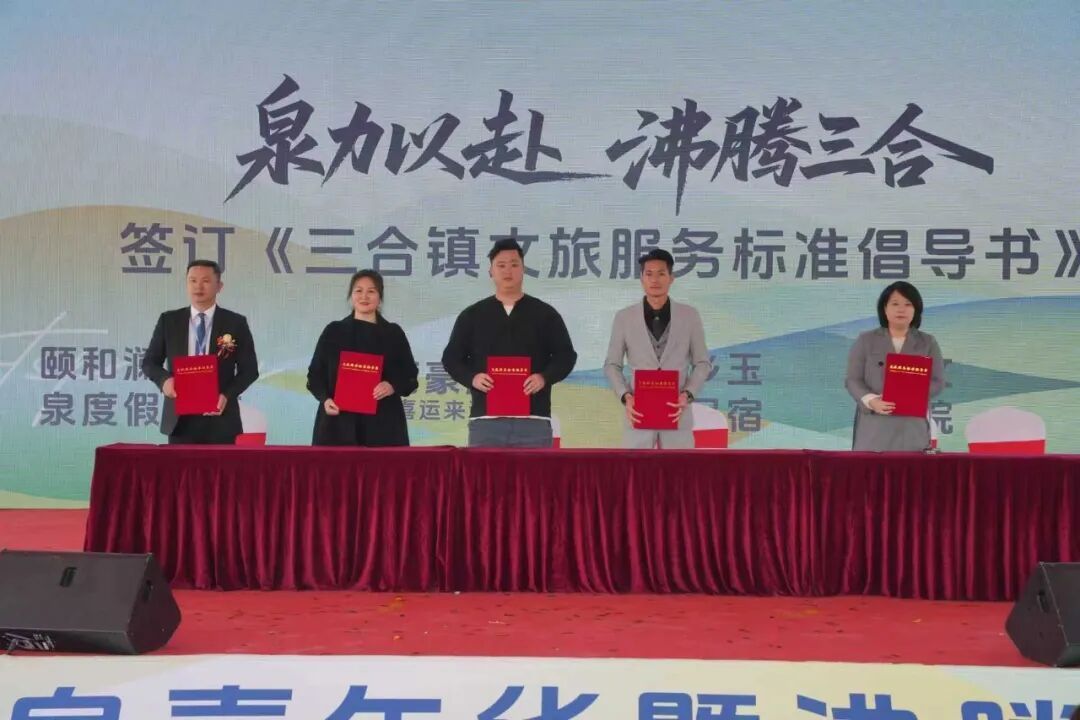 开幕式上,一系列重磅环节精准对接湾区发展需求。其中,《三合镇文旅服务标准倡导书》的签订备受瞩目,颐和澜悦温泉、喜运来温泉、凤乡玉怀民宿、三泉湾侨文化体验基地等多领域文旅企业代表分批签约,从温泉度假、民宿体验到餐饮服务、农产销售,全链条构建与湾区接轨的标准化服务体系,为每一位湾区游客提供专业优质、舒适便捷的体验保障。
